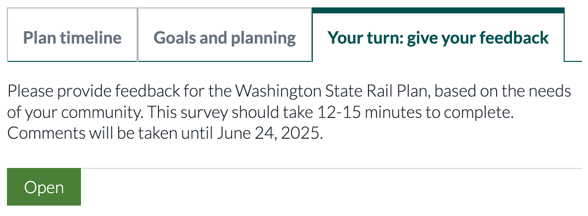 WSDOT is currently determining its priorities for the upcoming rail plan and is accepting public input until June 24, 2025. It is essential that we make our voices heard.